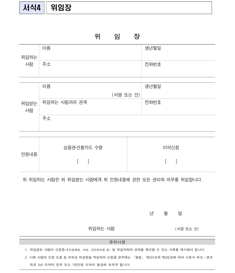 - 대리인 정보(이름, 연락처, 주민등록번호) 정확하게 기재